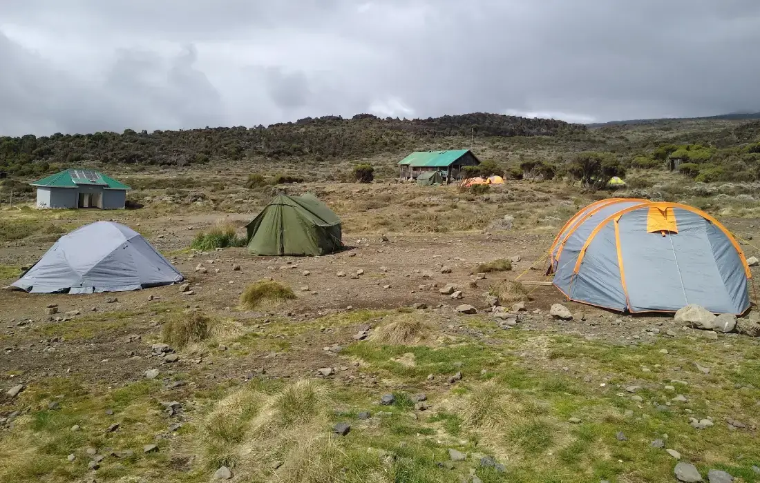 Head out across the moorland on a smaller path towards the jagged peaks of Mawenzi. The campsite is in a sheltered valley with giant Senecios nearby.
